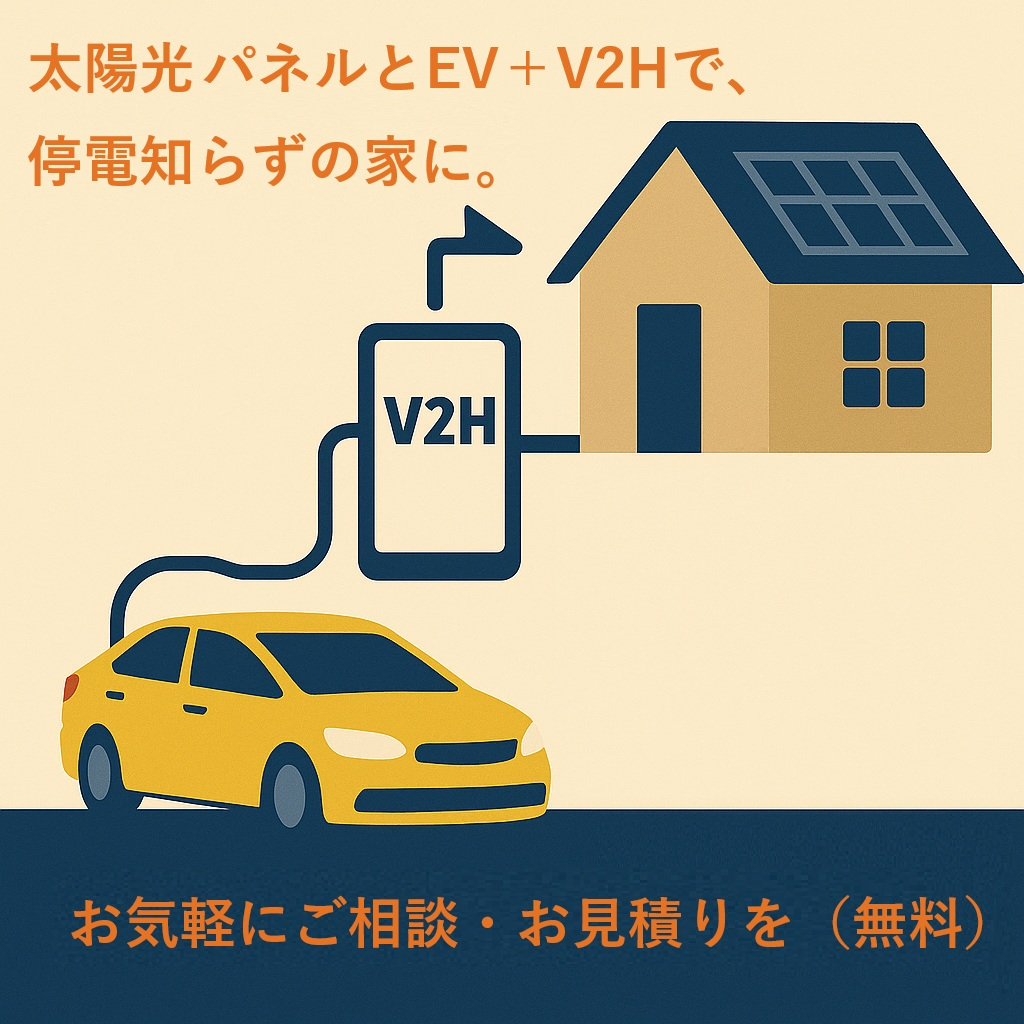 EVは移動手段だけではなく蓄電池としての活用が注目されています。V2H機器を使えば、EVに貯めた電気をご家庭で使用することができ、ご家庭の電力を効率的に使用できる可能性があります。また災害などで停電した場合もEVが非常用電源として活躍するので安心です。EVをお持ちであれば、ぜひ充放電器・外部給電器の導入をご検討ください!